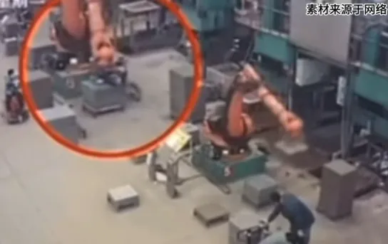 机器人周围没有看到安全围栏或安全光栅或安全毯,也就是说没有安全保护措施,而且机械臂靠近甚至碰到人之后,没有停止或减速,导致伤人事故发生。